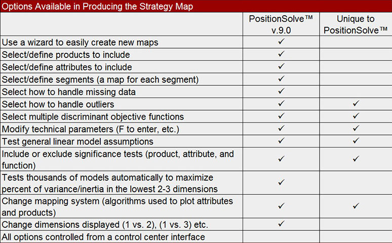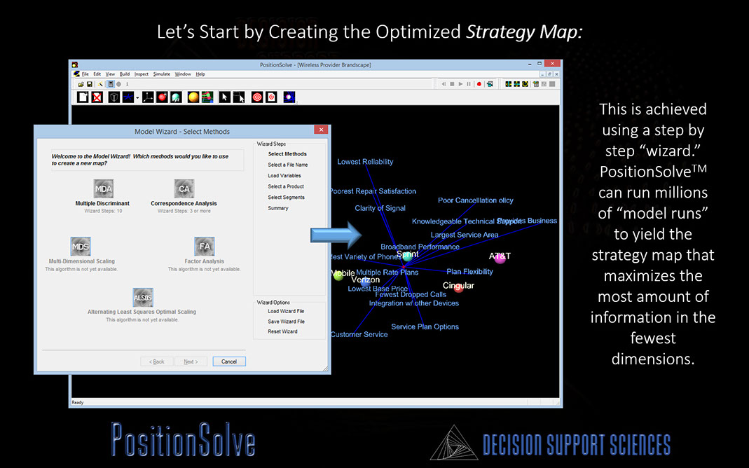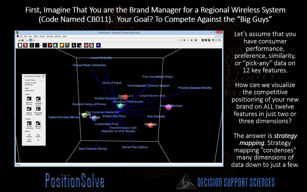 PositionSolve™ achieves these "what-ifs" by leveraging a wide variety of perceptual and volumetric data related to the competitive set. It then condenses those many dimensions of data into a strategy map. But unlike other "mapping" software PositionSolve™ is a dynamic strategy development tool, not just a static "picture".