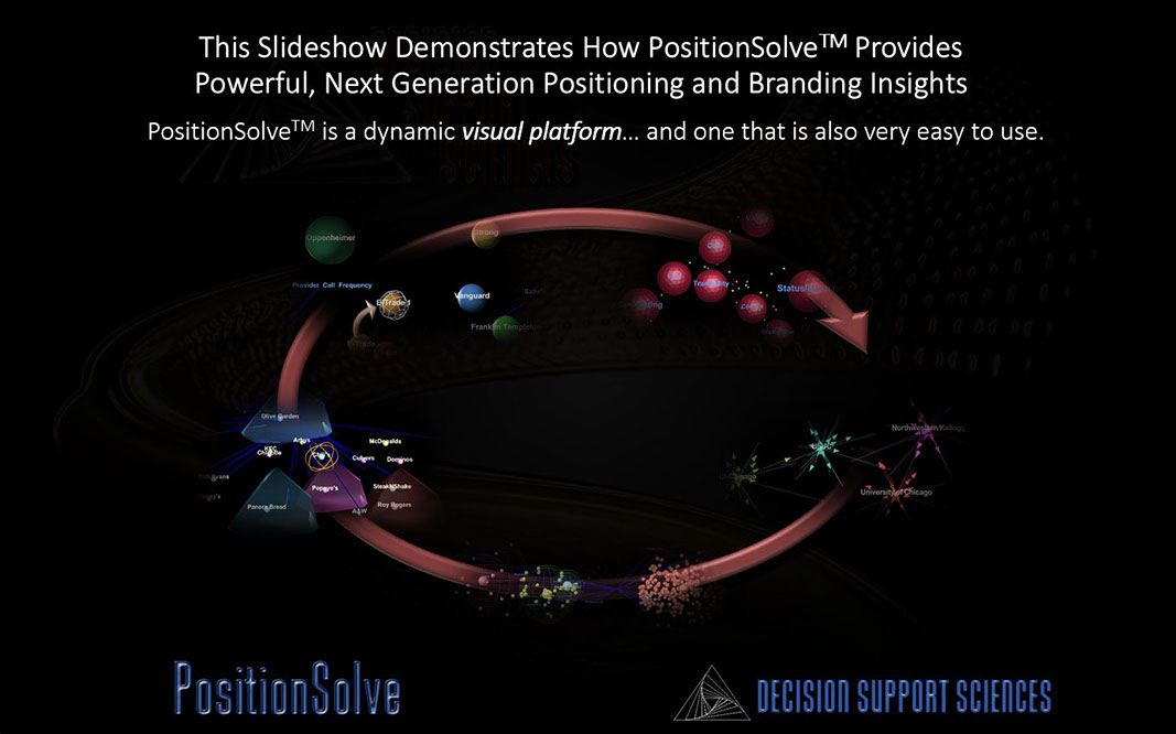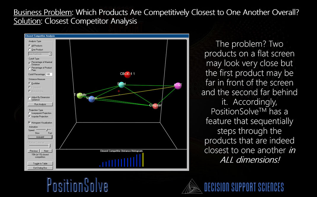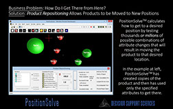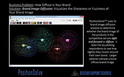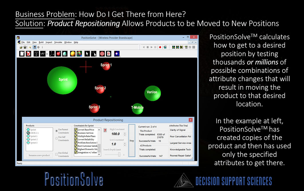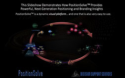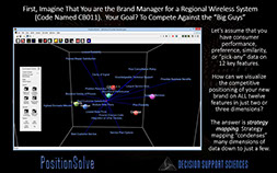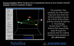 PositionSolve™ is not only visual (it compresses relevant information into a 3-D strategy map) it is dynamic. That is, PositionSolve™ lets the strategist "what-if" with a product's characteristics to see how those changes vary the positioning, preference and demand share of ANY competitor.