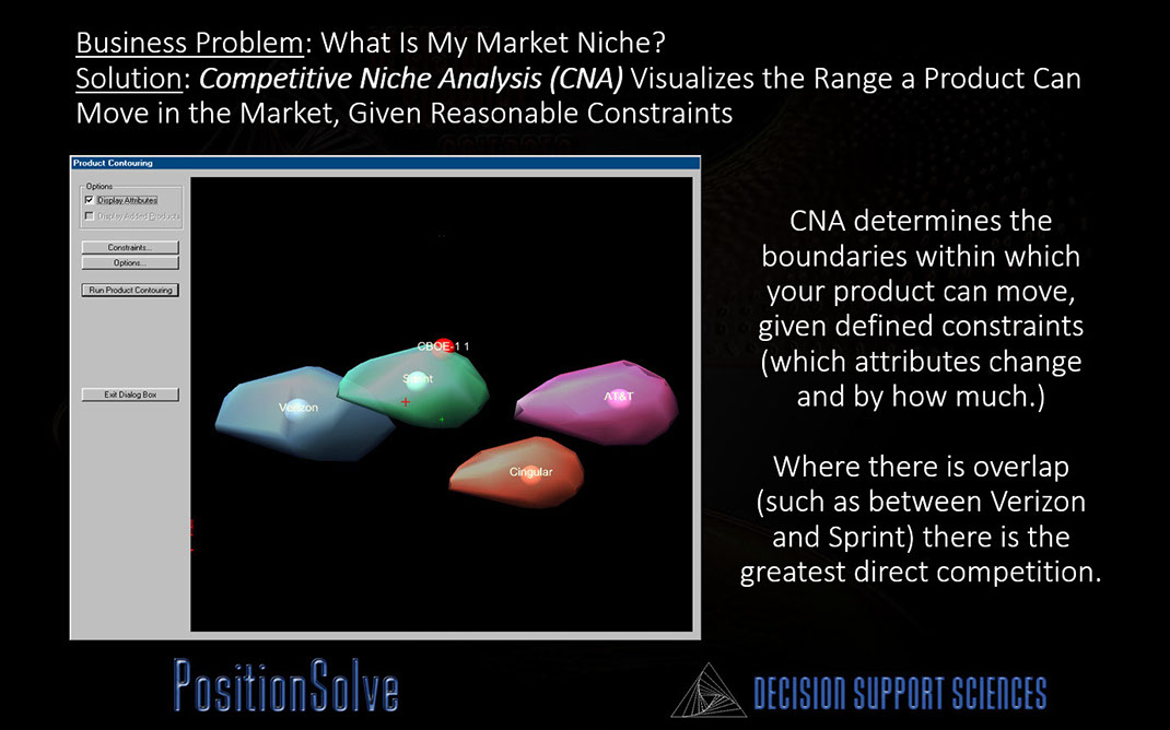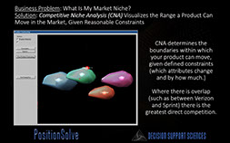PositionSolve™ performs competitive niche analysis by running hundreds of thousands of simulations for each product to see how "far" that product can move from its current positioning. The limits of a product's movement defines its realistic product niche. When products do NOT overlap they are in either safe/isolated competitive niches.