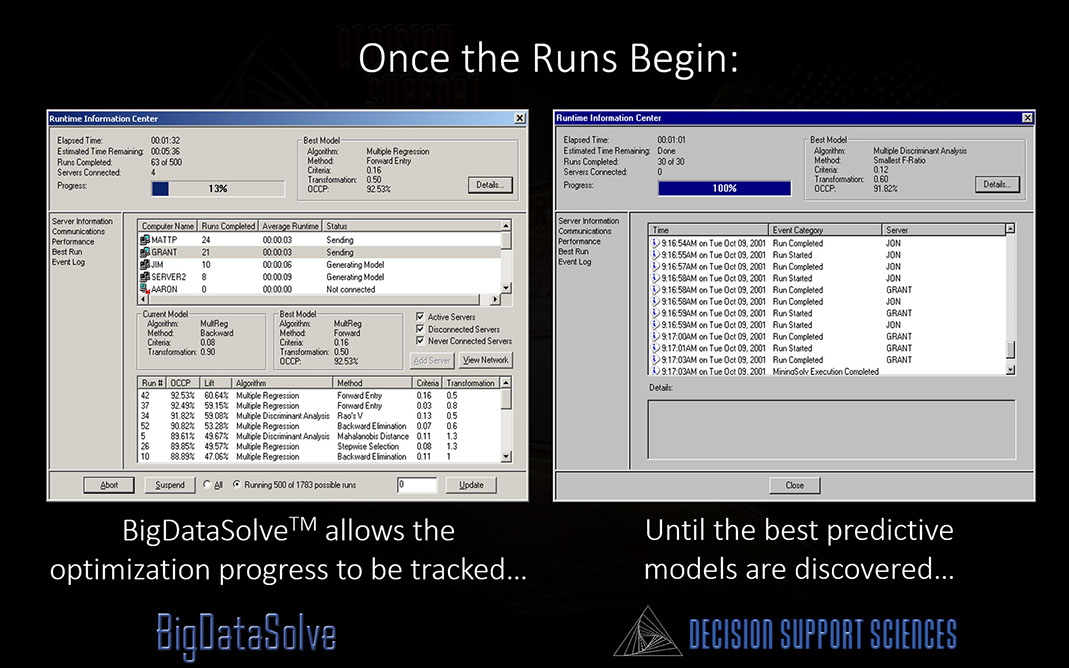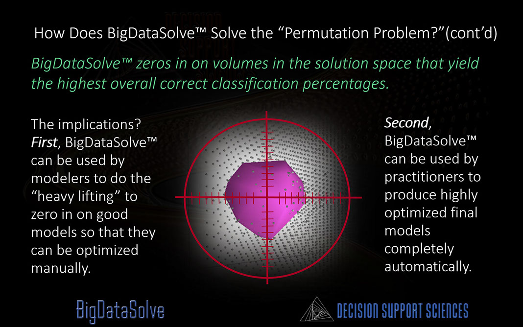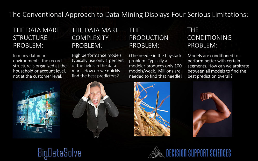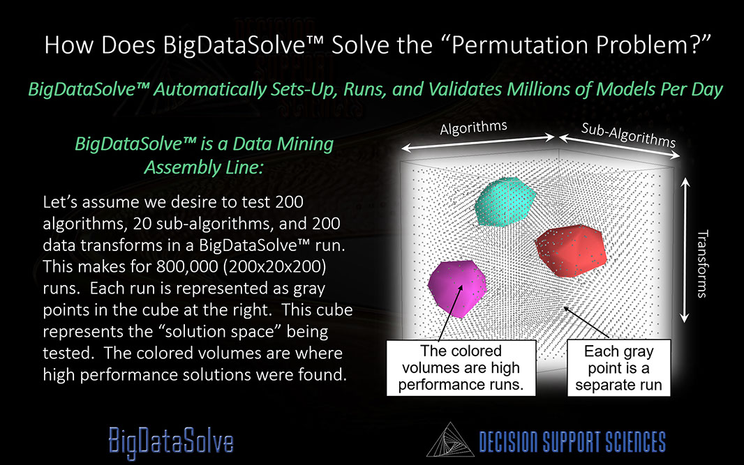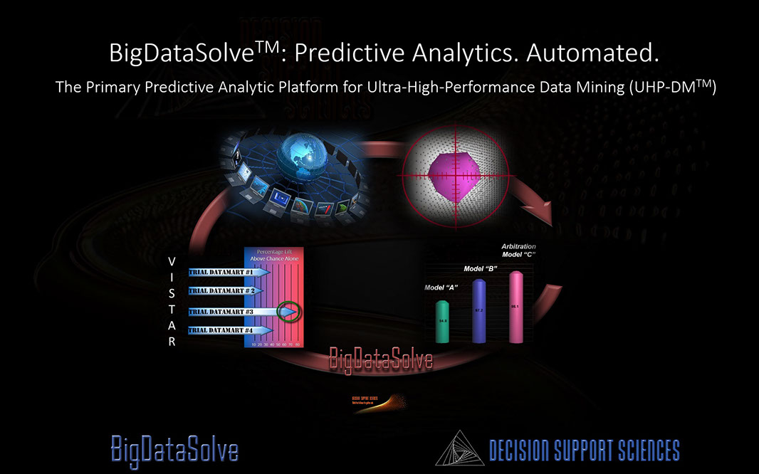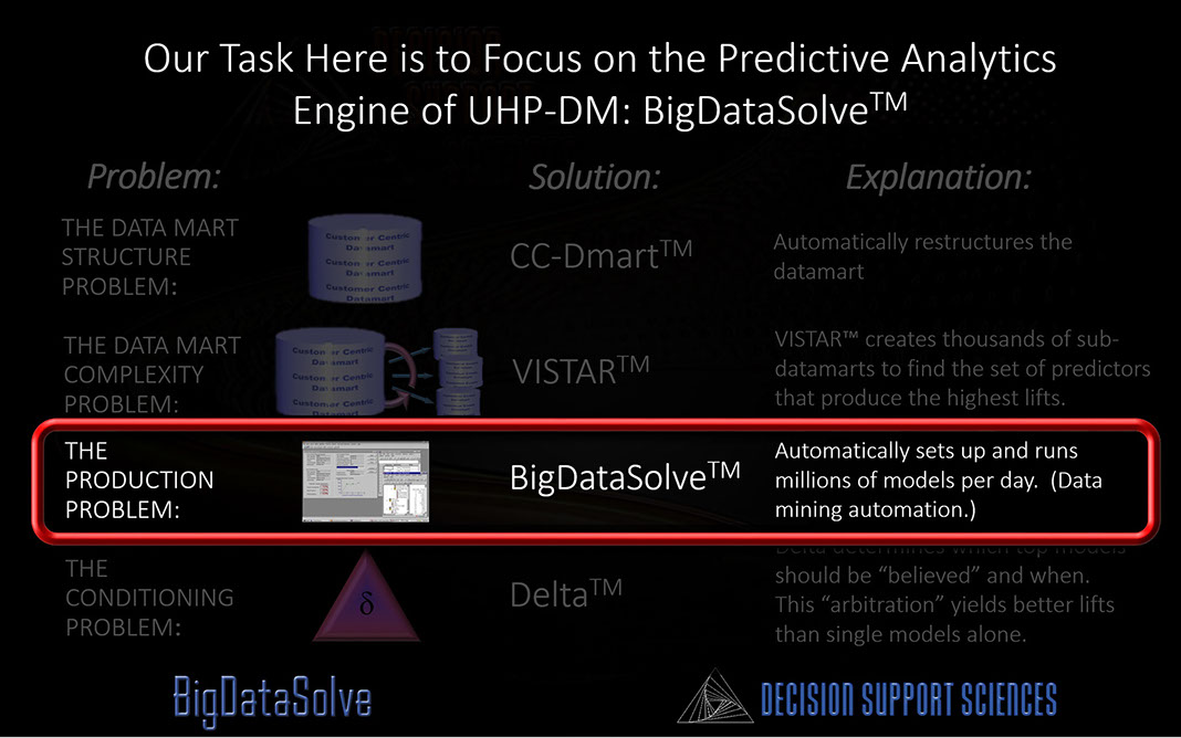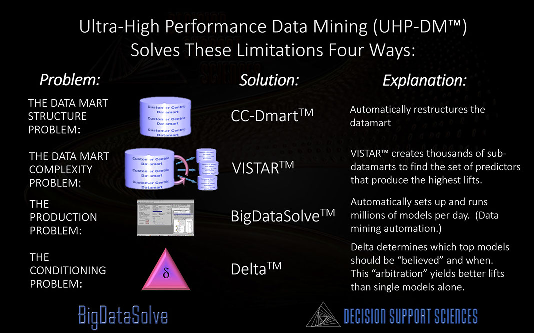Ultra-High Performance Data Mining (UHP-DM)™ takes predictive analytics to a new level. And BigDataSolve™ is the core enabling technology that undergirds it. BigDataSolveTM takes on the two key limitations that prevent other data mining software engines from yielding ultra high performance results: