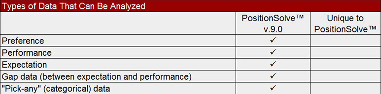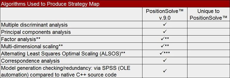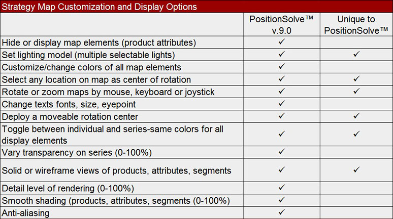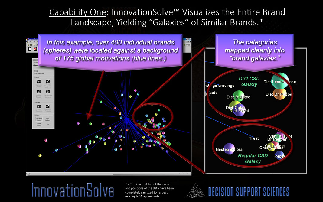 InnovationSolve™ has all the capabilities of PositionSolve,™ that is, it is a superset of PositionSolve™. As such, it allows the strategist to understand which competitors are truly closest to one another, how far products can move on the brand landscape, how diffuse a product's brand image is, how to penetrate competitive niches, how to visualize market segments, and how to perform competitive repositioning.