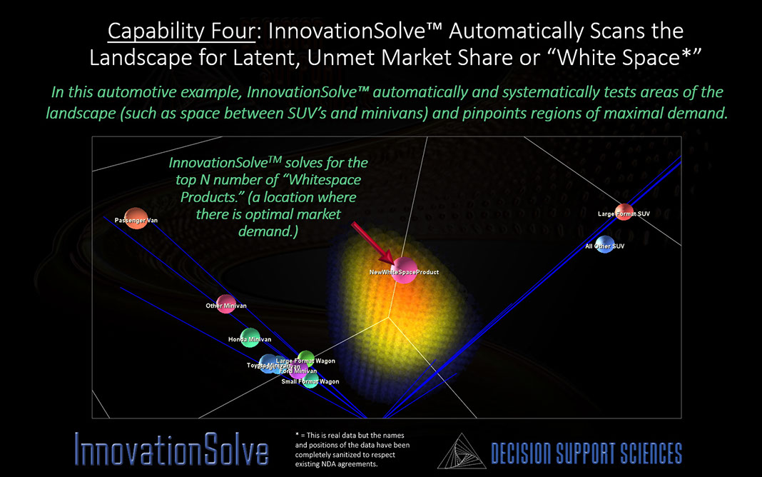 InnovationSolve™ also probes into every point in the DemandScape™ to find if building a product at each of those locations will either create new demand or win share from existing competitors. The best of those newly developed products can then be handed over to the ProductSolve™ simulator to identify how much preference share and dollar volume opportunity will be produced when that product is launched.