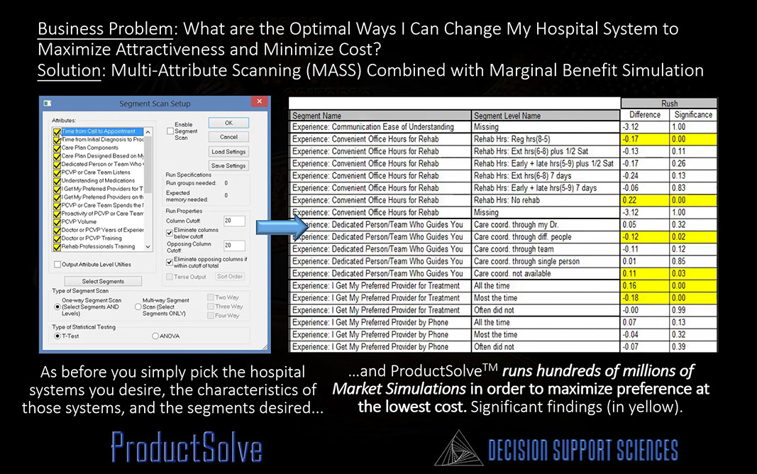 Most marketers are aware that, not infrequently, the entire profit model from a product or service may arise from only one or two market segments. Accordingly ProductSolve™ has the capability to automatically set up and scan for 1) significant analytical findings (e.g. importance, performance, expectation, etc.) and 2) optimal products across hundreds or thousands of market segments. The latter capability can be combined with goal-solving to automatically search and solve for product configurations within segments of customers that will produce optimal real world outcomes (RWO) for your product or service.