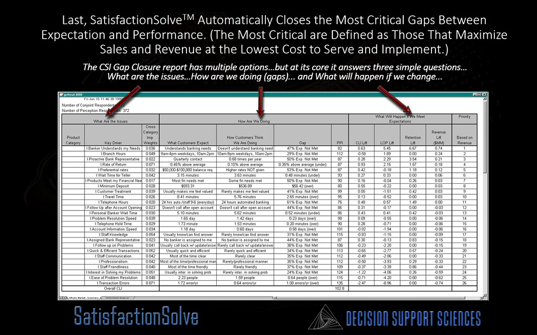 What would you have? You would have SatisfactionSolve™. SatisfactionSolve™ (or SatisSolve™ for short) is a decision support platform that uses the captured decision drivers of customers to gain and retain high value customers.