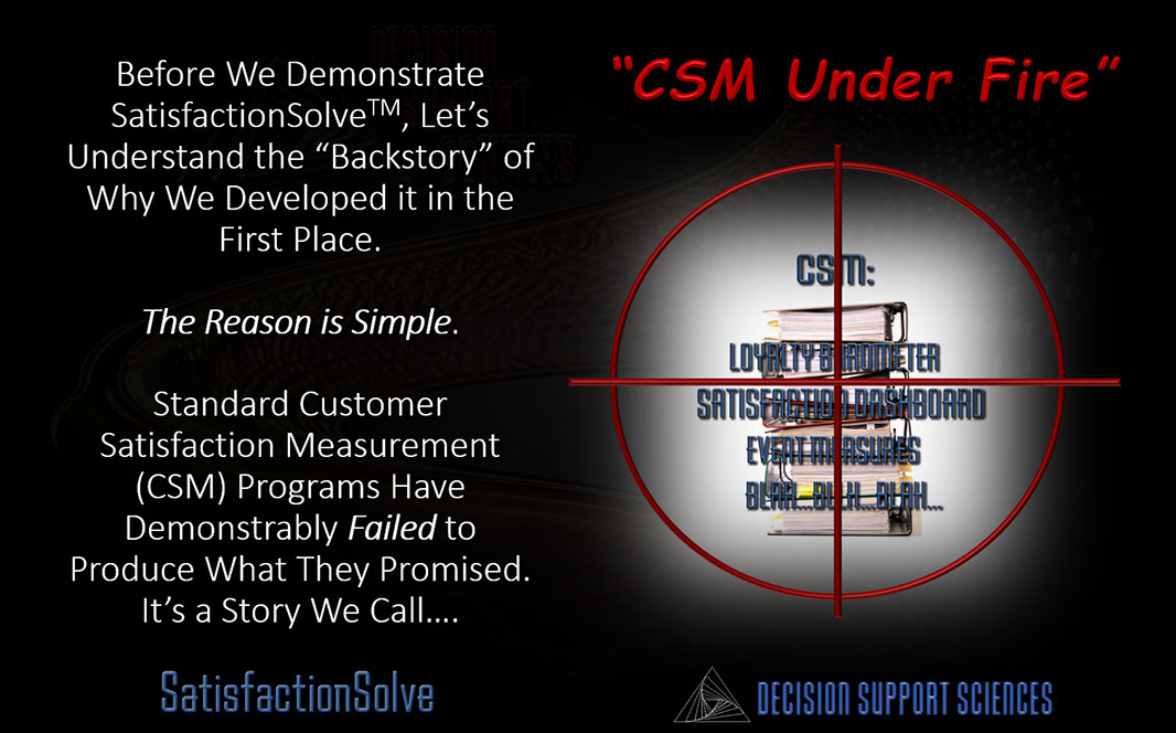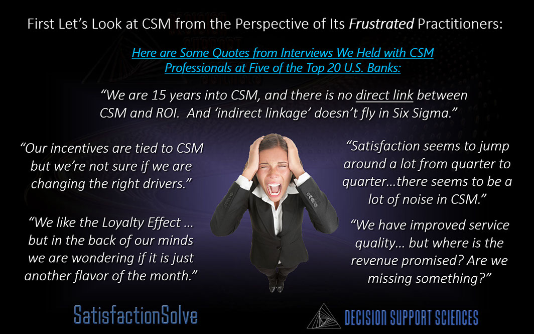 There is no pretty way to say it. Customer Satisfaction Measurement (CSM) has utterly failed. It's legacy? CSM deeply measured metrics that did not link to real-world outcomes. We discovered this in 1994...even before Fred Reicheld published his landmark insight that CSM linked reliably to only one thing: the likelihood to recommend. This also led us to survey actual practitioners...to see how deep the CSM rabbit hole really went. See their quotes above! Their insights led us to re-engineer CSM into producing value for both the organization and the customer -- a business line we call Customer Value Maximization (CVM).