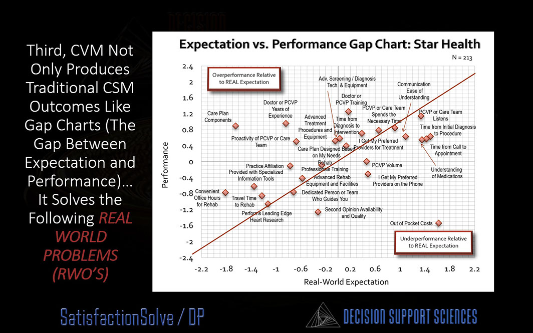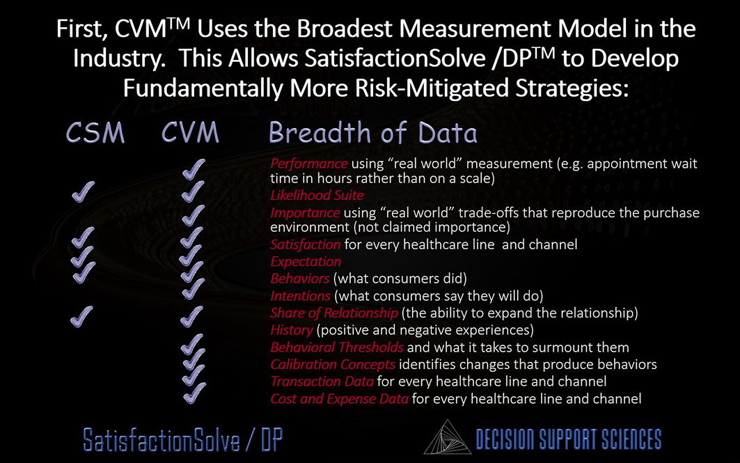 CVM (Customer Value Maximization) uses the broadest measurement model in the industry. These measures have two primary advantages over CSM's measures. First, by using a far broader set of measures (not just attitudinal, but behavioral, historical, threshold, cost, calibration etc.) CVM characterizes the customer far more deeply. Second, we use psychometrically informed approaches to collect the data. These approaches recognize that certain attitudes are typically overstated or understated by consumers. (See the explanation of Real World Expectation below as an example.) These two advantages allow SatisfactionSolve /DP™'s deep insight discovery tools to develop more risk-mitigated strategies than ever before.