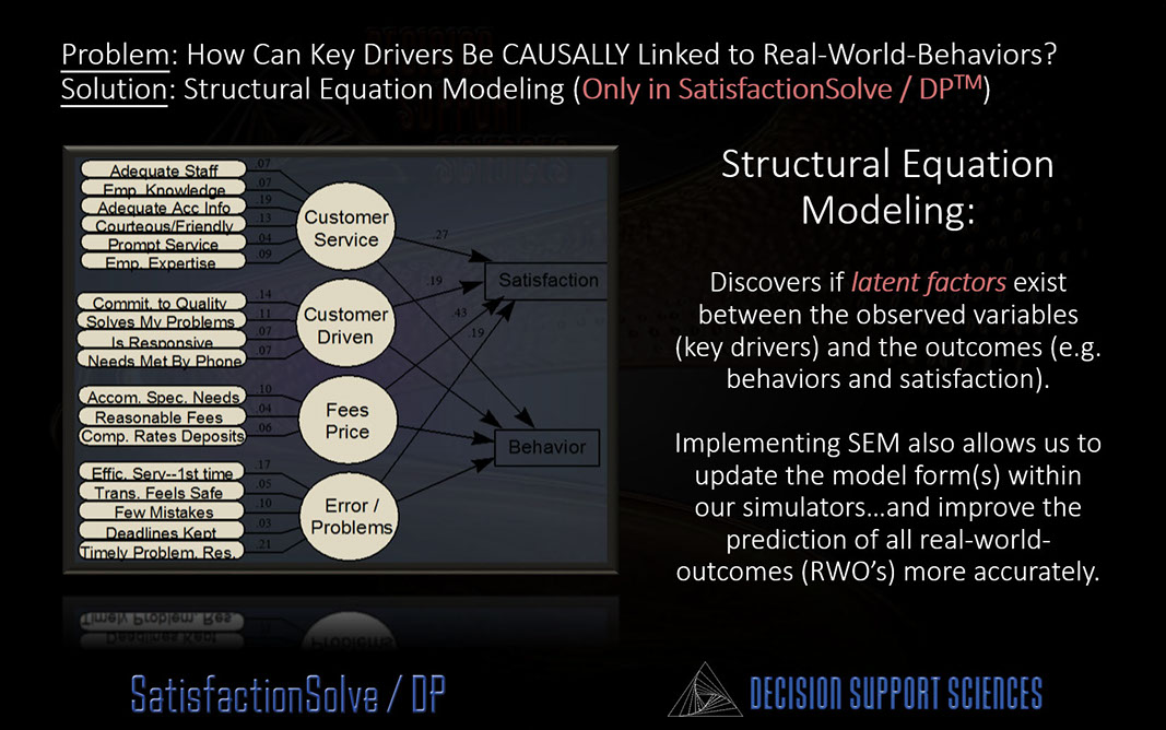 SatisfactionSolve /DP™ predicts real-world outcomes (see the ninth benefit above.). The problem? Standard simulation models assume a very simple (and usually over-simplistic) relationship between the key drivers (what was measured in the survey) and the real-world outcomes (like purchase or switching.) Structural Equation Modeling (or SEM) is the "gold standard" for figuring out that relationship. Very often there are intermediate (latent) variables between the observed key drivers and the outcomes. Because SEM usually fits the data FAR better than standard models, once SEM identifies a much better model we then build that into SatisfactionSolve /DP™'s predictive real-world outcome (RWO) models.