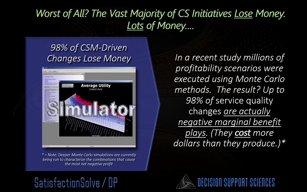 And what about ROI? In terms of ROI, historically, over 95% of CSM engagements have actually lost money. Accordingly, let's expose another CSM myth. CSM tells us to "exceed expectations." This makes for a "feel good" motto - but is simply foolhardy to give consumers exactly what they want. Doing so will bankrupt you...and barely dent Real World Outcomes (RWO's). In contrast, we attach ABC costing amounts to every change level of every key driver. Thus, we know exactly how much a change will cost to implement and to maintain. This allows our models (e.g. sales, switching, etc.) to maximize those outcomes at the lowest cost to implement and the lowest cost to serve.