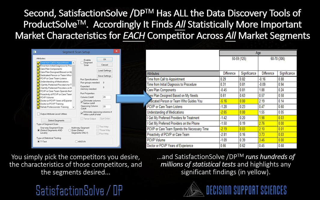 SatisfactionSolve /DP™ is not only for customer satisfaction! In fact SatisfactionSolve /DP™ has embedded within it ALL the capabilities of ProductSolve™. Why you might ask? ProductSolve™ is the premier decision support platform to identify which changes to you products and services will maximize Real World Outcomes (RWO's) at the lowest cost to implement and the lowest cost to maintain.