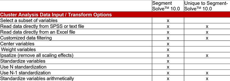 At the core of SegmentSolve™ lies 13 advanced clustering algorithms which, in turn, are combined with different distance measures, starting solutions, data normalizations and variable combinations to yield thousands of discrete approaches to segmentation. The result? Advanced measurement combined with advanced algorithmics. That's SegmentSolve™.