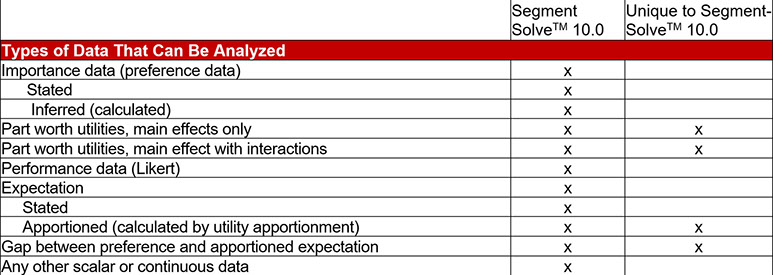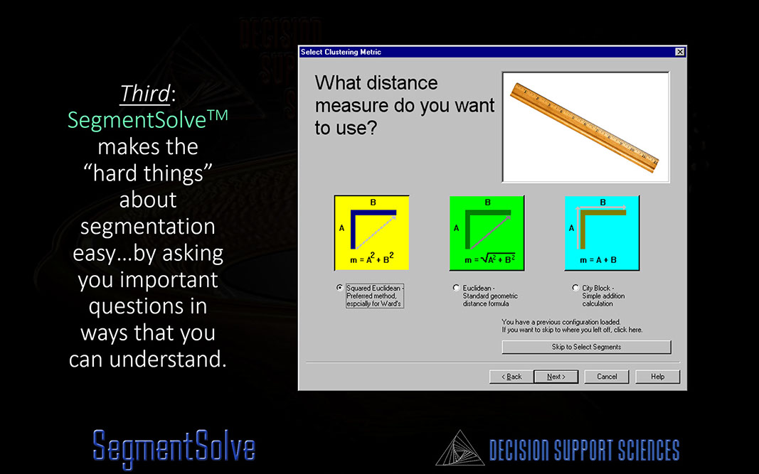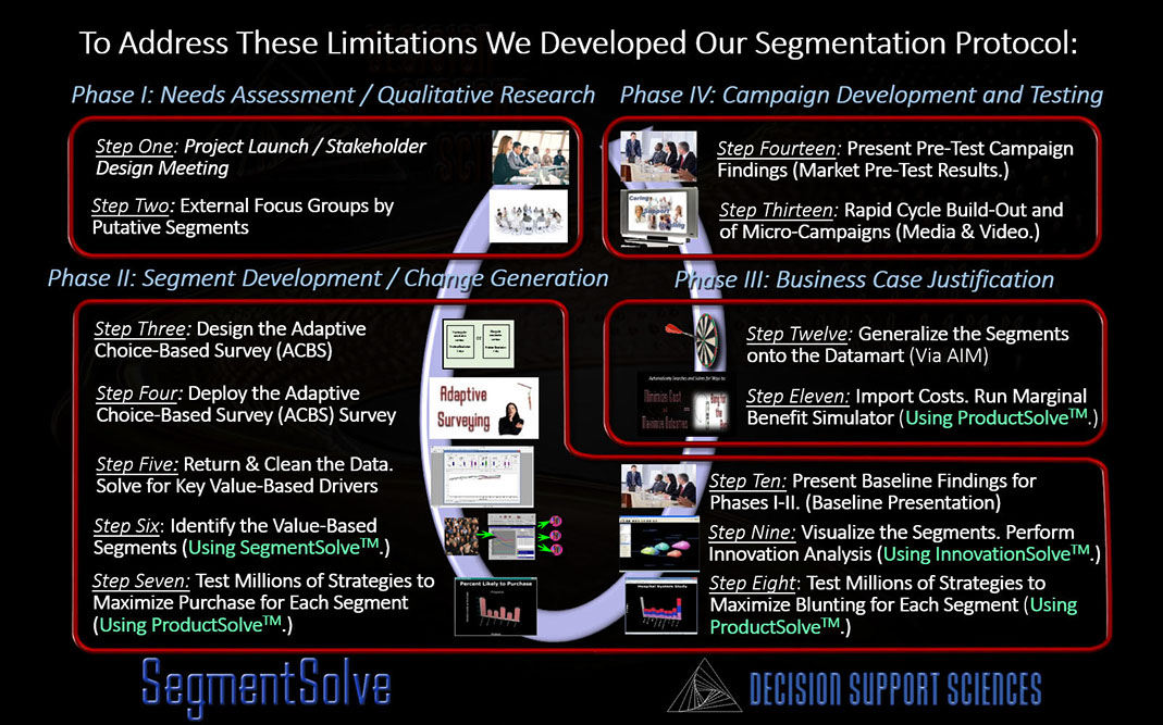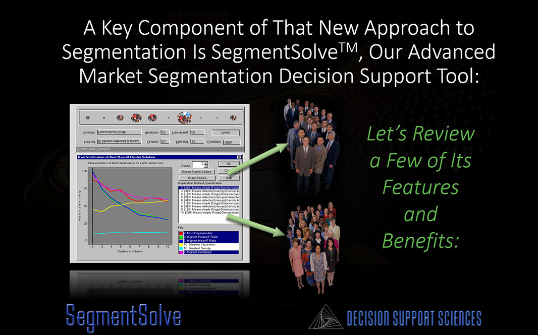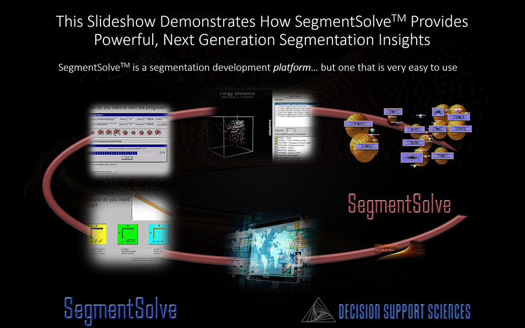 Discovering optimum market segments...isn't easy. That's why the segmentation wizard within SegmentSolve™ meets six critical segmentation criteria: 1) it makes hard things easy (see the above) 2) it is deeply customizable (it has both simple and advanced modes) 3) it allows you to vary the internal logic of the Expert System 4) it lets you trade-off speed vs. depth 5) it converges upon best solutions intelligently and 6) it allows you to save successful runs to a knowledge repository.