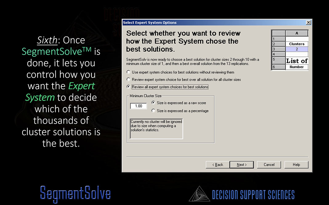 One of the most powerful benefits of using SegmentSolve™ is its embedded Expert System (ES). The ES uses a predefined (but customizable) set of criteria to determine which clusters are "best." Strategists can operate the ES in three modes that range from a "strong" ES to a passive ES. Regardless of mode, SegmentSolve™ takes the work out of finding truly optimal segments.