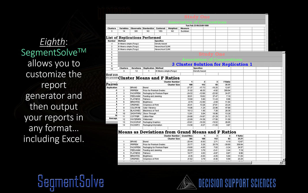 In the final analysis the "gold standard" for any high performance segmentation is the presence of intuitive patterns of key-drivers that covary together (co-deviate significantly either positively or negatively) from the mean. SegmentSolve™ reports this, of course, but it doesn't stop there. SegmentSolve™ includes an advanced report generator with a wide variety of ways to format and report the data, display the individual segments and present the various parameters of the run as a whole.