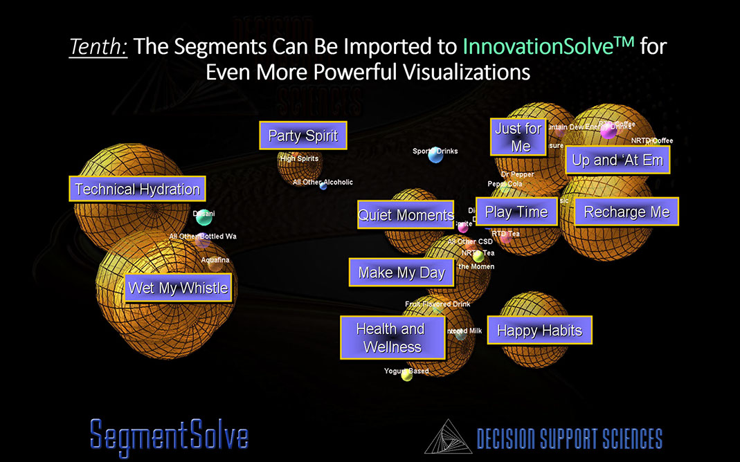 Segmentation of course, is not the end of marketing strategy...it is the beginning. Once the strategist has developed clean, crisp segments, three action steps are indicated. First, those segments should be used to design more profitable products. Second, those segments should be visualized to understand their proximity to existing products and existing demand. (See the image above.) Third those segments should be striped (imputed) onto the retail datamart. These three activities are described more fully in our Segmentation practice .