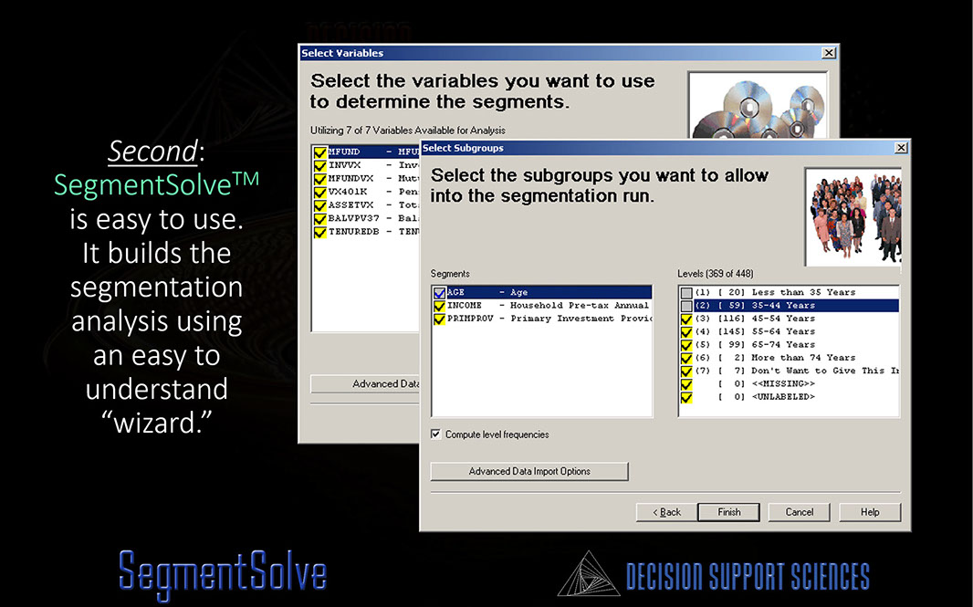 Like all of our software, SegmentSolve™ "encapsulates complexity" - it allows the strategist to answer a simple set of questions (implemented via a software "wizard"). How can answering simple questions produce industry-leading segmentation outcomes? Simply stated, Industry-leading outcomes happen when 1) the data is the right data 2) the questions asked are the RIGHT questions and 3) the underlying technology itself is industry-leading.