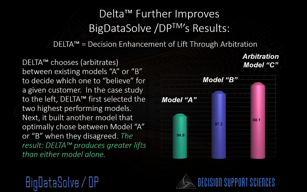 Every model tends to work best with a given segment, that is, it is conditioned to work better with certain consumers. Why, then, can't we just create a model of models....where we use the model that works best for given customers? Actually, we can! This is called arbitration modeling. We pioneered it 20 years ago in our financial services practice. DELTA (a capability within BigDataSolve /DP™) let's you do better than the best!