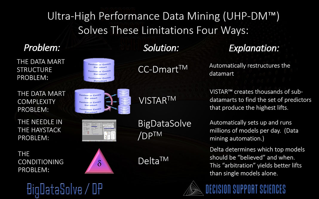 Ultra-High Performance Data Mining (UHP-DM)™ takes predictive analytics to a new level. And BigDataSolve /DP™ is the core technology that undergirds it. It takes on the four key limitations that prevent data mining from producing breakout results.