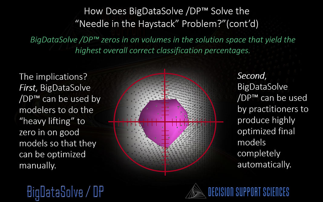 To produce the highest results (lifts) you need to find the optimal model that "sees" your data best. This begs another question! Is there a more productive way to find the needle in the haystack (the best algorithm, transforms. sub-algorithm. etc.)? You bet there is...and it is called BigDataSolve /DP™. BigDataSolve /DP™ plays with "all the knobs" automatically...so you don't need to! In so doing BigDataSolve /DP™ creates a solution space and converges on the optimal model and model form. Automated predictive analytics has arrived.