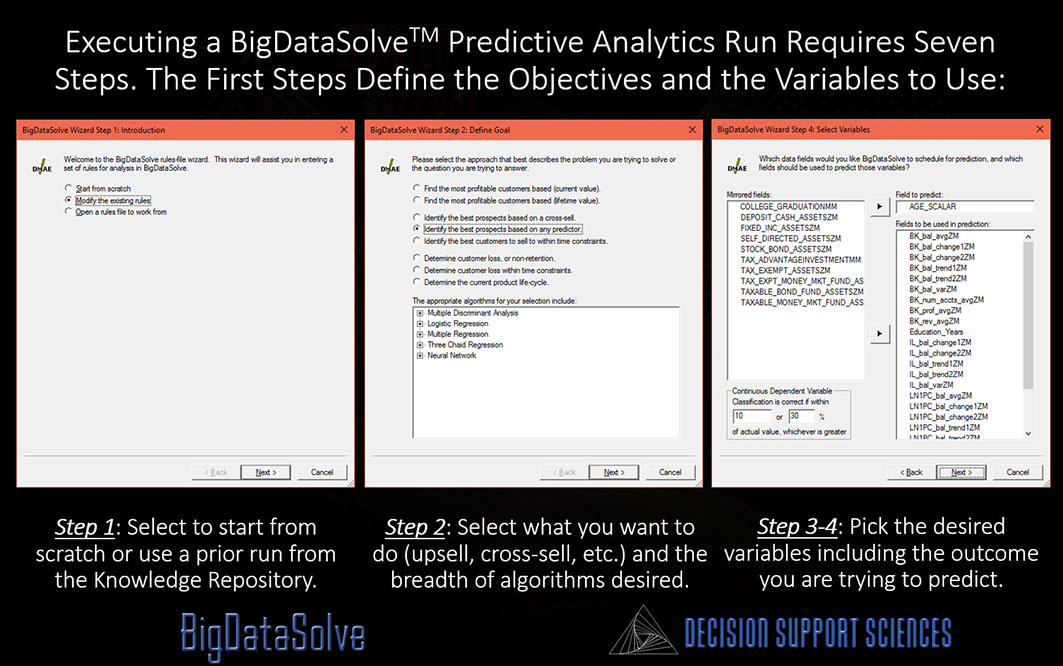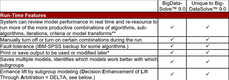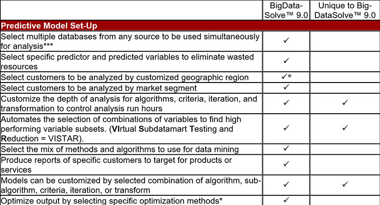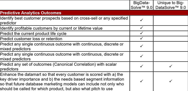 Ultra-High Performance Data Mining (UHP-DM)™ takes predictive analytics to a new level. And BigDataSolve™ is the core enabling technology that undergirds it. BigDataSolveTM takes on the two key limitations that prevent other data mining software engines from yielding ultra high performance results: