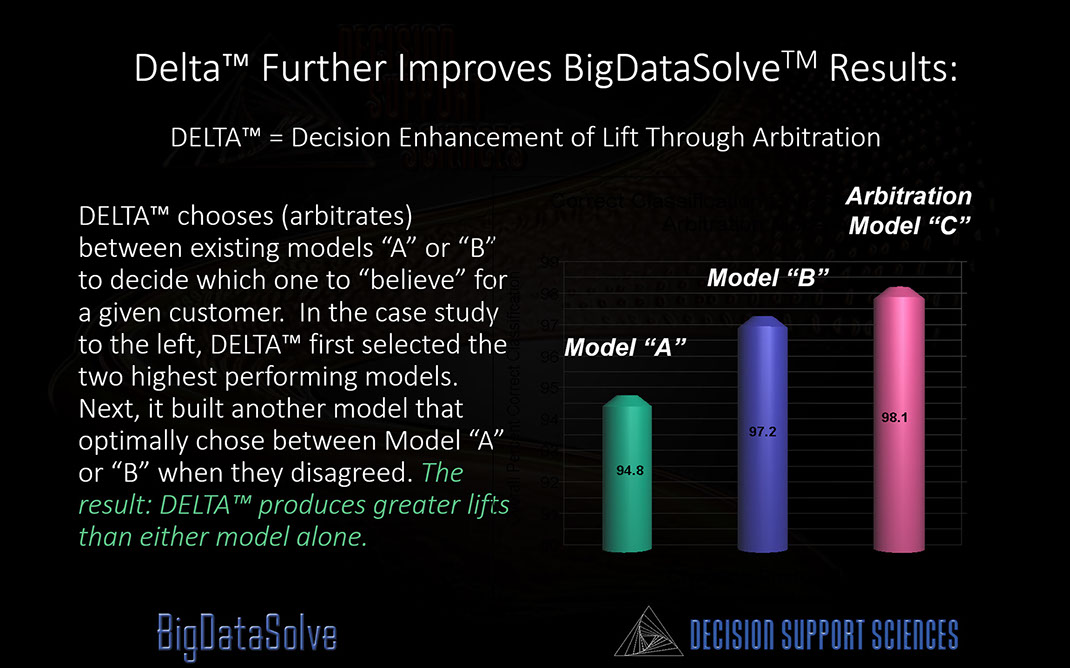 Every model tends to work best with a given segment, that is, it is conditioned to work better with certain consumers. Why, then, can't we just create a model of models....where we use the model that works best for given customers? Actually, we can! This is called arbitration modeling. We pioneered it 20 years ago in our financial services practice. DELTA (a capability within BigDataSolve™) let's you do better than the best!