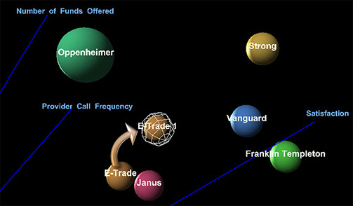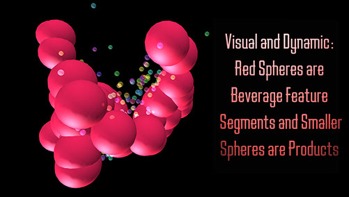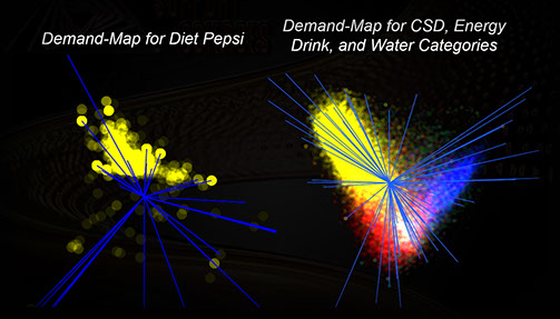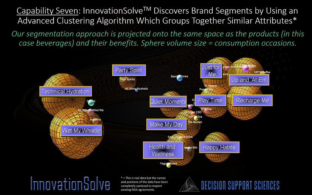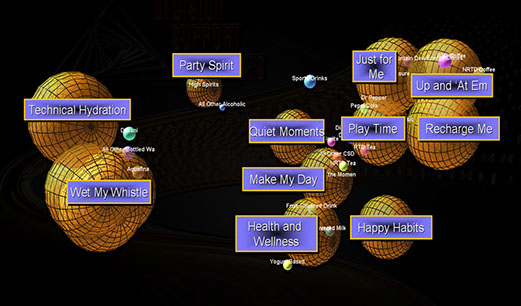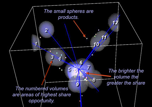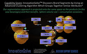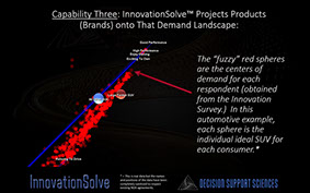 InnovationSolve™ is not only visual (it compresses relevant information into a 3-D strategy map) it is dynamic. That is, it lets the strategist "what-if" with the a product's characteristics to see how those changes vary the positioning, preference and demand share of ANY competitor. Above is only one of many analyses of InnovationSolve™, a map of products (in this case from the beverage industry) in relationship to the segments from that same industry.