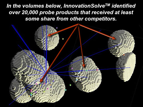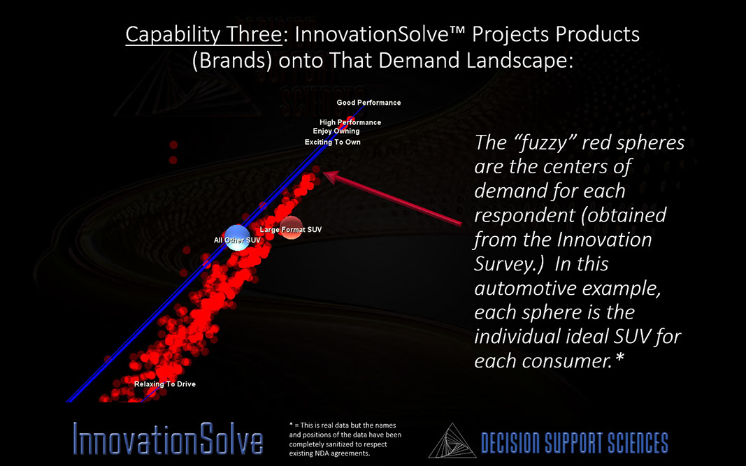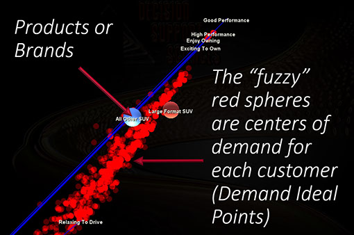 One of InnovationSolve™'s unique capabilities is that it uncovers latent demand within the brand landscape. Demand is the missing link in most strategy systems. Demand (seen here as bright semi-transparent spheres) tells us where we should build new products as well as telling us how we should message that new innovation. Being the first competitor to meet latent demand, of course, often yields dramatic improvements in market share.