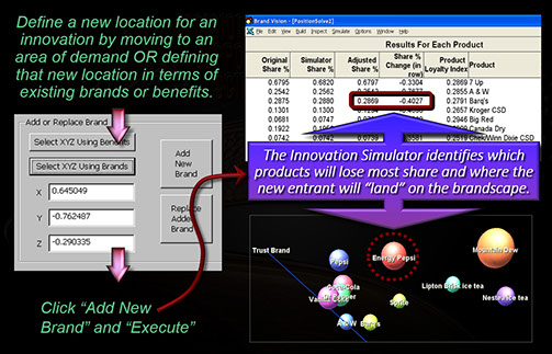 InnovationSolve™ allows the strategist to define a new location for an innovation two ways: 1) by moving to an area of demand OR b) defining that new location in terms of existing brands or benefits. The Innovation Simulator then builds that new innovative product and identifies which products will lose most share and where the new innovative product will “land” on the DemandScape™.