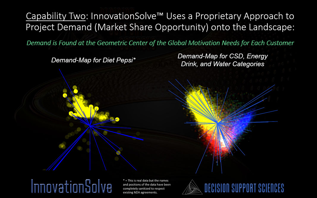 Just as PositionSolve™ can visualize products or brands in terms of attributes, InnovationSolve™ can visualize the center of products or brands in terms of Global Motivational Benefits on the DemandScape.™