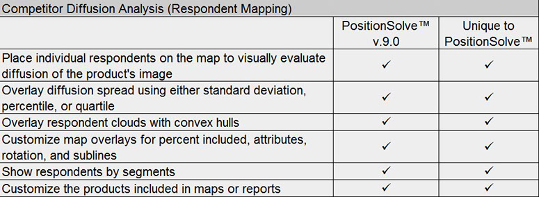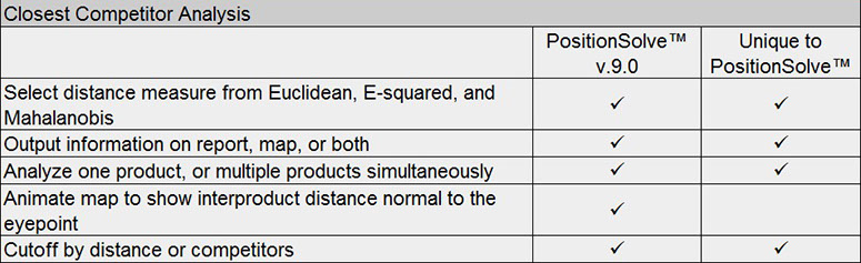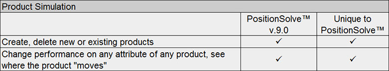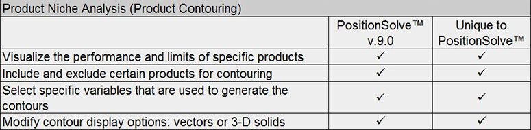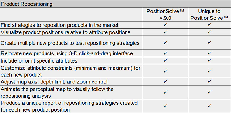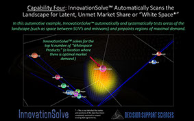InnovationSolve™ has all the capabilities of PositionSolve,™ that is, it is a superset of PositionSolve™. As such, it allows the strategist to understand which competitors are truly closest to one another, how far products can move on the brand landscape, how diffuse a product's brand image is, how to penetrate competitive niches, how to visualize market segments, and how to perform competitive repositioning.