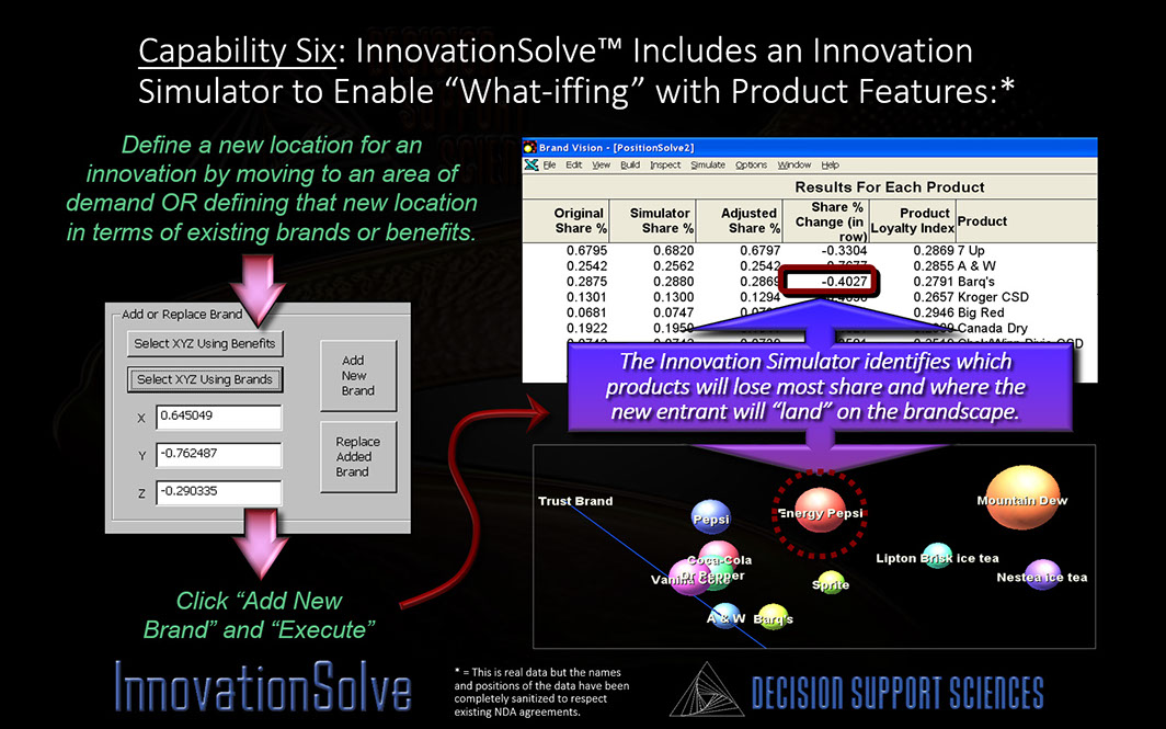 InnovationSolve™ is the decisioning platform (DP) superset of PositionSolve™. It has all the capabilities of PositionSolve™ but incorporates habituation/brand loyalty and latent demand into the brand landscape. That is, it not only automatically tests and prioritizes thousands of risk-mitigated strategies to arrive at an improved competitive position but it quantifies how much share (preference, market or demand) those strategies will capture in the marketplace.