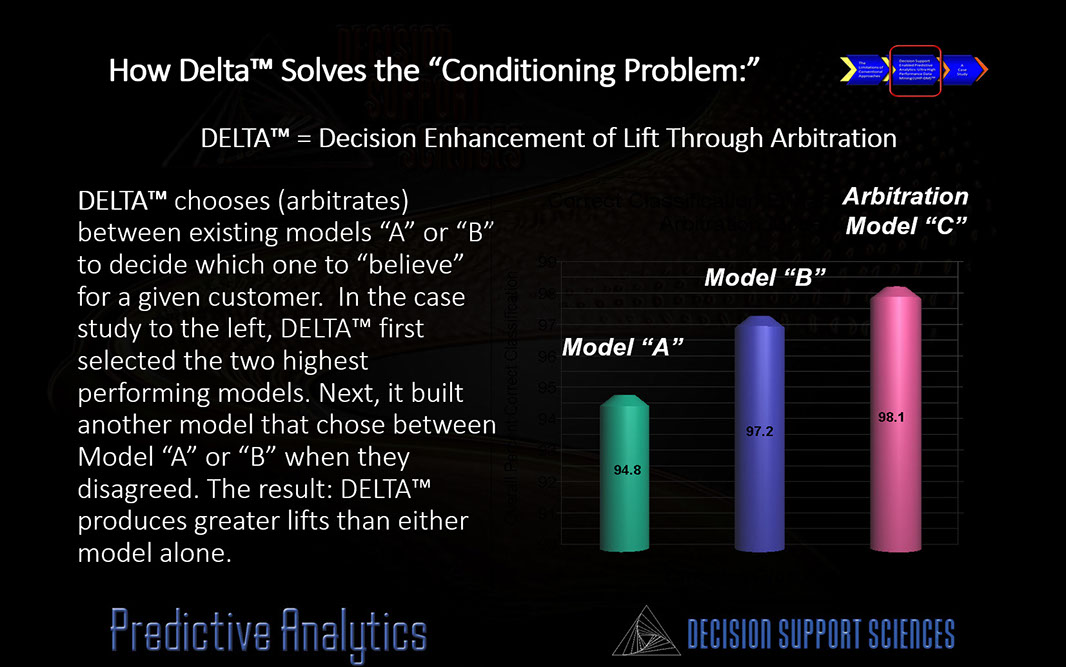 Every model tends to work best with a given segment, that is, it is conditioned to work better with certain consumers. Why can't we just create a model of models....where we switch between models intelligently with certain customers? Actually, we can! This is called arbitration modeling. We pioneered it 20 years ago in our financial services practice. DELTA let's you do better than the best!