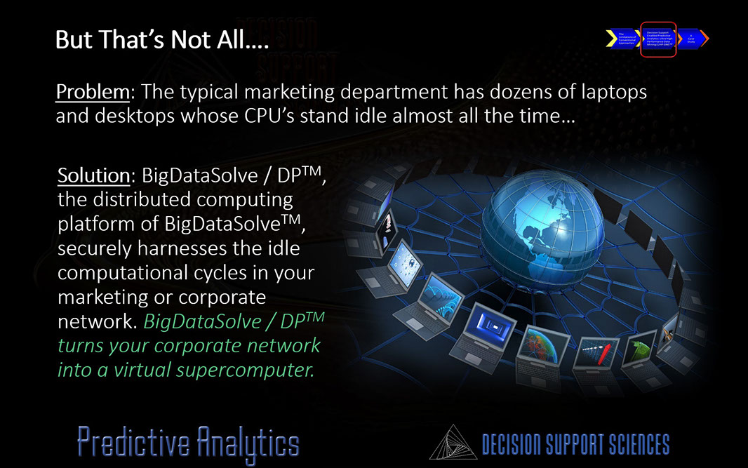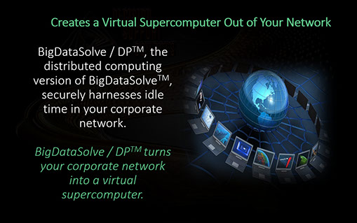 Here is where it gets REALLY cool! Did you know that the typical corporate network has 10 times the power of your "big iron"...or your cloud-based provider's big iron? BigDataSolve™ /DP (the DP stands for Decision Platform) is an enhancement to BigDataSolve™. It turns your corporate network into a virtual supercomputer. Securely!