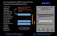 Here is a case study performed for one of the top five regional banks in the country. What happens when you solve the Data Structure Problem, the Data Complexity Problem, the Needle in the Haystack problem, and the Conditioning Problem all at once? You produce 300% higher lifts than conventional data mining. Welcome to decision support enablement!