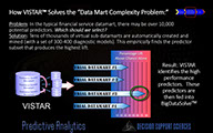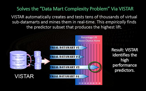 To produce the highest results (lifts) you need to find the best predictors. After all, "garbage in...garbage out." This, of course, begs the larger question, namely, is there a more productive way to find the best predictors? There is...and we call it VISTARTM. VISTARTM stands for Virtual Subdatamart Testing and Reduction. VISTARTM fires up the rapid modeling mart and convergently tests a) which predictors and in b) which combinations will produce the highest performing results.
