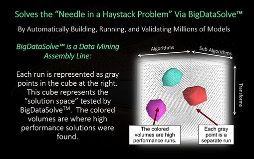 To produce the highest results (lifts) you need to find the optimal model that "sees" your data best. This begs another question! Is there a more productive way to find the needle in the haystack (the best algorithm, transforms. sub-algorithm. etc.)? You bet there is...and its called BigDataSolve™. BigDataSolve™ plays with "all the knobs" automatically...so you don't need to! In so doing BigDataSolve™ creates a solution space and converges on the optimal model and model form. Automated predictive analytics has arrived.