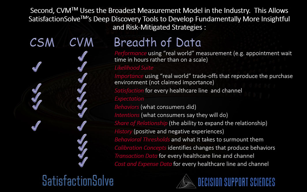 CVM (Customer Value Maximization) uses the broadest measurement model in the industry. These measures have two primary advantages over CSM's measures. First, by using a far broader set of measures (not just attitudinal, but behavioral, historical, threshold, cost, calibration etc.) CVM characterizes the customer far more deeply. Second, we use psychometrically informed approaches to collect the data. These approaches recognize that certain attitudes are typically overstated or understated by consumers. (See the explanation of Real World Expectation below as an example.) These two advantages allow SatisfactionSolve™'s deep insight discovery tools to develop more risk-mitigated strategies than ever before.