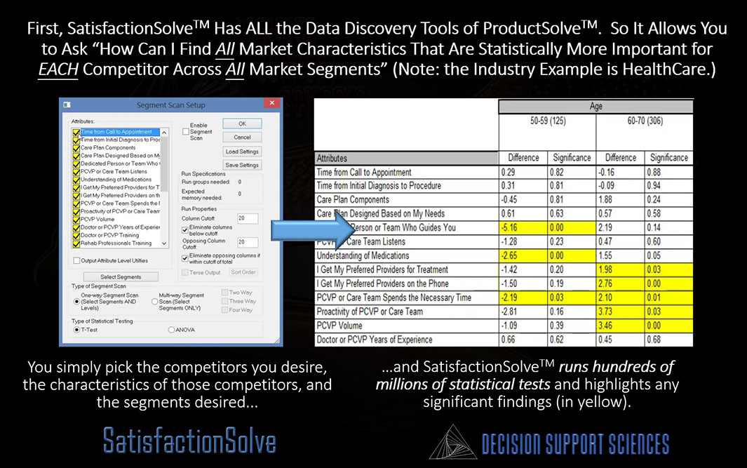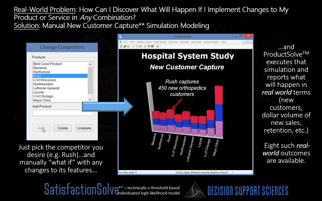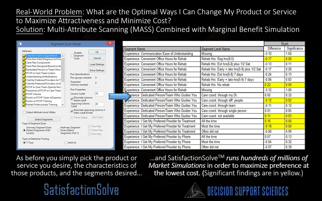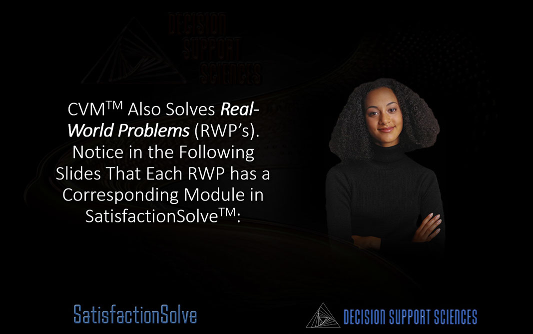 SatisfactionSolve™ is not only for customer satisfaction! In fact SatisfactionSolve™ has embedded within it ALL the capabilities of ProductSolve™. Why you might ask? ProductSolve™ is the premier decision support platform to identify which changes to you products and services will maximize Real World Outcomes (RWO's) at the lowest cost to implement and the lowest cost to maintain.