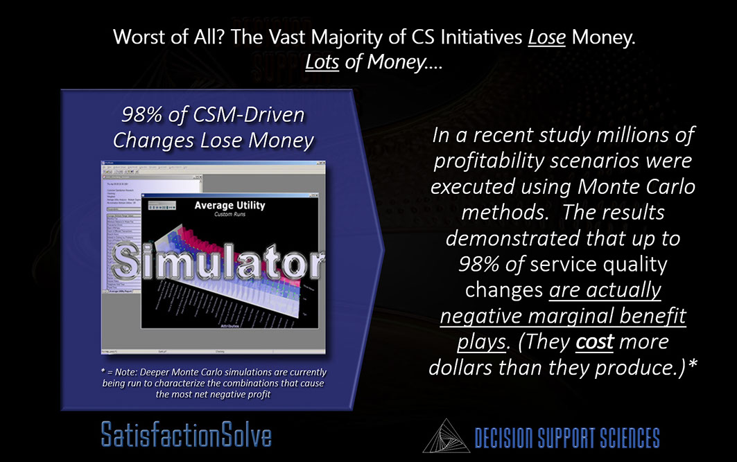 And what about ROI? In terms of ROI, historically, over 95% of CSM engagements have actually lost money. Accordingly, let's expose another CSM myth. CSM tells us to "exceed expectations." This makes for a "feel good" motto - but is simply foolhardy to give consumers exactly what they want. Doing so will bankrupt you...and barely dent Real World Outcomes (RWO's). In contrast, we attach ABC costing amounts to every change level of every key driver. Thus, we know exactly how much a change will cost to implement and to maintain. This allows our models (e.g. sales, switching, etc.) to maximize those outcomes at the lowest cost to implement and the lowest cost to serve.