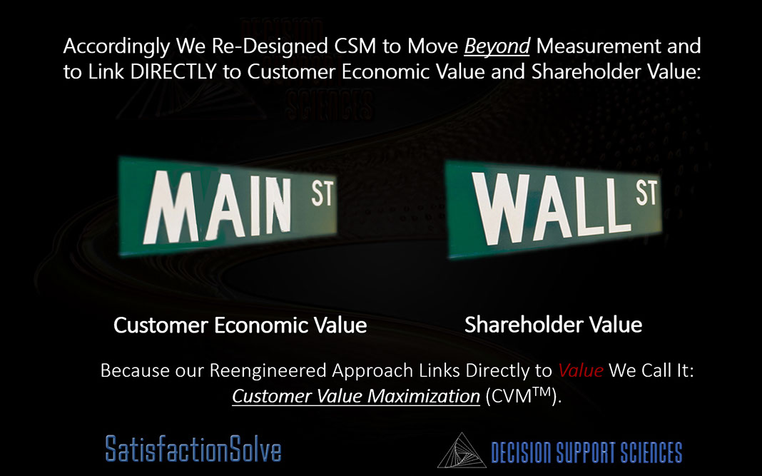 There is no pretty way to say it. Customer Satisfaction Measurement (CSM) has utterly failed. It's legacy? CSM deeply measured metrics that did not link to real-world outcomes. We discovered this in 1994...even before Fred Reicheld published his landmark insight that CSM linked reliably to only one thing: the likelihood to recommend. This also led us to survey actual practitioners...to see how deep the CSM rabbit hole really went. See their quotes above! Their insights led us to re-engineer CSM into producing value for both the organization and the customer -- a business line we call Customer Value Maximization (CVM).