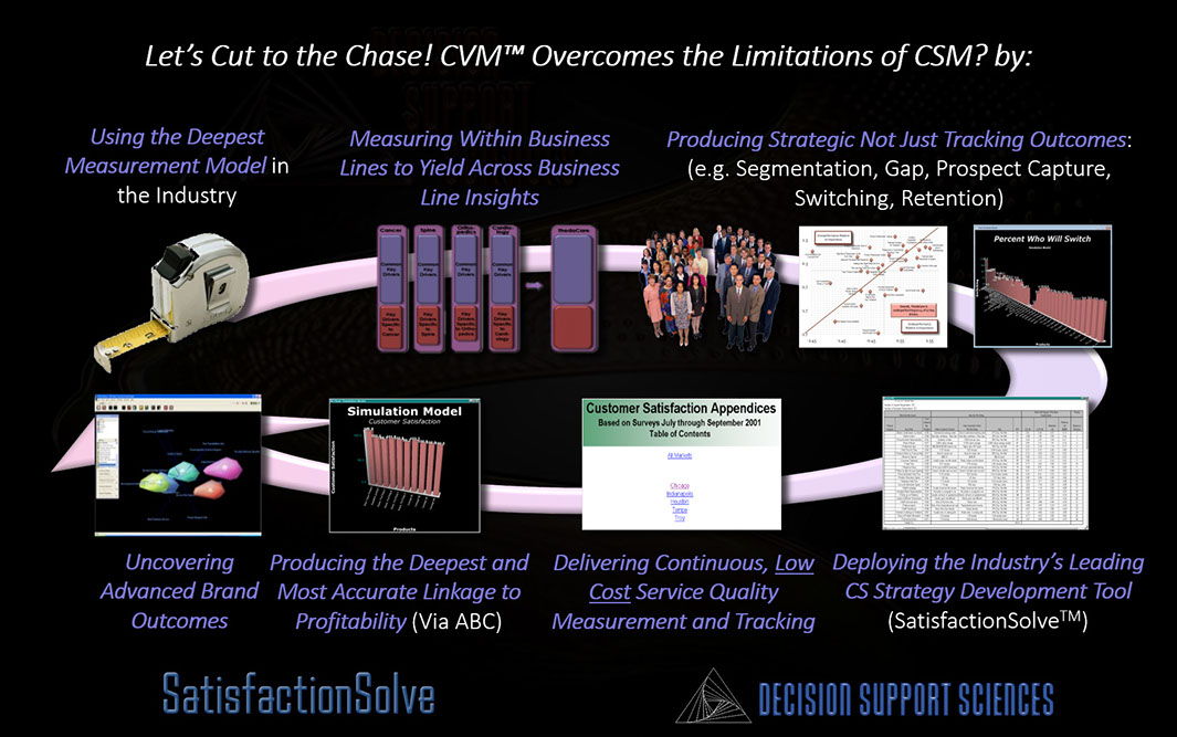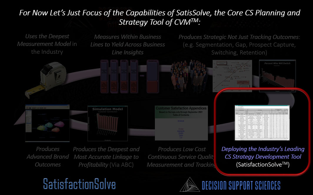 What would you have? You would have SatisfactionSolve™. SatisfactionSolve™ (or SatisSolve™ for short) is a decision support platform that uses the captured decision drivers of customers to gain and retain high value customers.