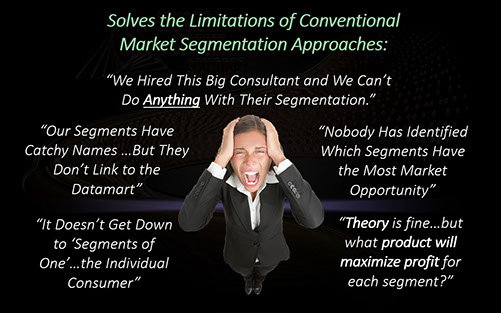 There is no pretty way to say it. Market Segmentation initiatives demonstrably fail most of the time. The problem? Conventional segmentation: 1) tends to be strategic and not tactical 2) doesn't provide specific product strategies that increase profit 3) doesn't tell us what specific products and services we need to build for each customer to produce real-world outcomes (sales, retention, profit.) 4) doesn't reside on the data mart...where tactics get deployed.