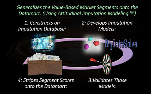 The strategic capabilities of our segmentation practice are competitively unparalleled (maximizing purchase, maximizing switching, and maximizing competitive blunting for each segment.) But there is still something missing....tactics. Since the central decisioning platform for tactical market deployment and sales capture is the datamart (or cloud server) how do we get the power of value-based segmentation onto the datamart? The answer is our datamart enhancement vertical, and its Attitudinal Imputation Modeling (AIM) protocol. AIM uses multivariate imputation to generalize the segments developed from the survey segments onto every record in the datamart.