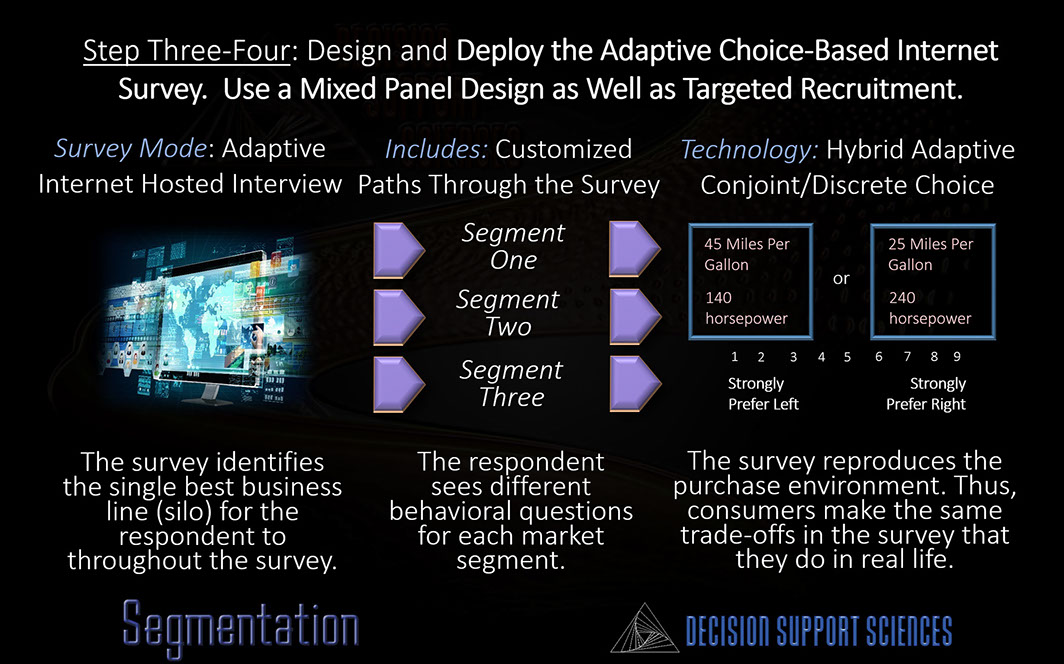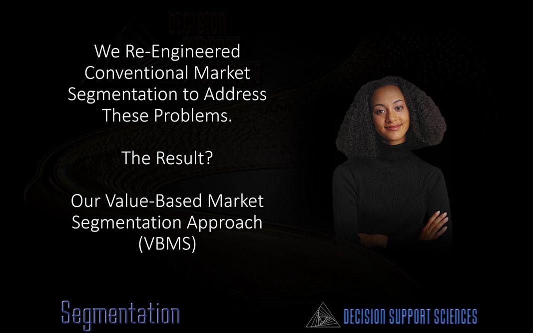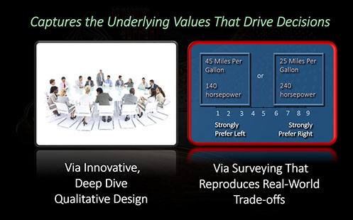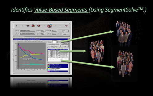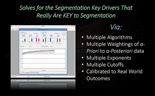 Research has now made it clear that simply asking customers what they like does NOT cut it. In contrast, our segmentation protocol requires the consumer to make the same TRADE-OFFS in survey that they make in real life. In this way consumers reveal their TRUE values. Next, of course, one must accurately SOLVE for those values. We pioneered our advanced utility calculation approach 20 years ago...and it still leads the industry in accuracy.