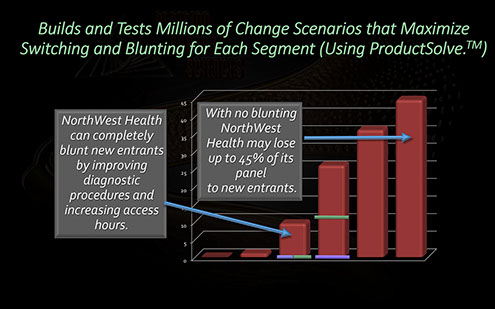 Two of the most powerful real-world outcomes built into ProductSolve™ are switching and blunting. Switching simulation identifies the product configurations that will maximize switching to your product or brand. Blunting, in contrast, identifies how the strategist can protect any product from competitive attrition. By importing the value-based segments developed by SegmentSolve™ into ProductSolve™ these outcomes can be extended to every relevant segment in the market..