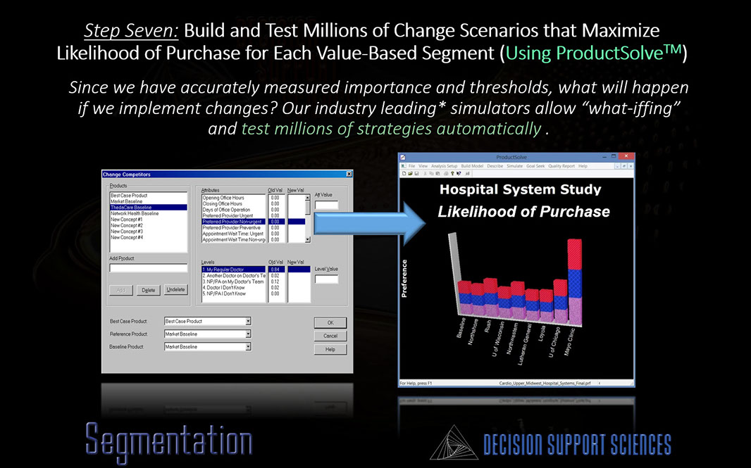 Developing 1) value-based segments and 2) importing them into ProductSolve™ allows us to identify which specific existing or new products or services will be most attractive to each segment. One of the most powerful real-world outcomes built into ProductSolve™ is the likelihood of purchase (LOP) simulator. LOP simulation (coupled with imported value-based segments) provides the most powerful current insight delivery platform for capturing new customers within each and every segment.