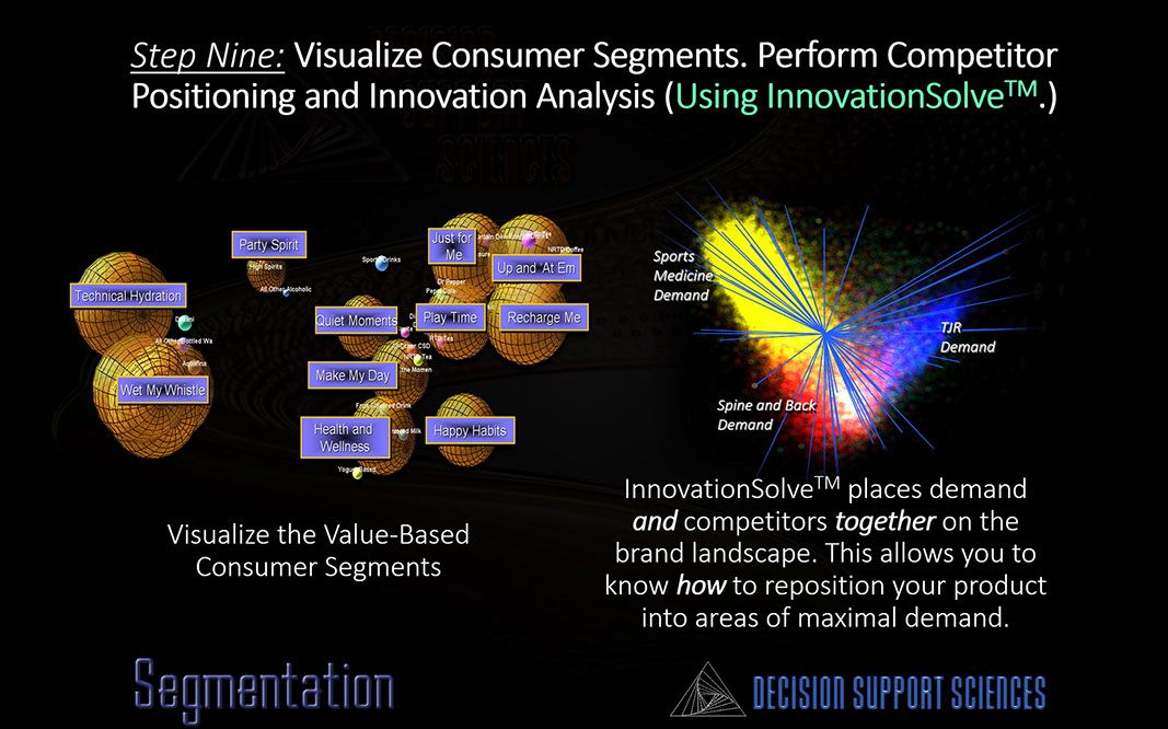 One of the most powerful advantages to developing value-based segments within a framework of decision support is that previously separate decision support outcomes can now be integrated. An example? InnovationSolve™, our innovation decisioning platform can accurately locate both brands and demand on the same landscape. This means that we can now import each value-based segment into InnovationSolve™ and perform Segment-Specific Innovation (SSI).