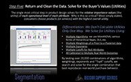 Segmentation uncovers the combinations of key drivers that are most attractive to consumers. The problem? Conventional "one-size-fits-all" segmentation tends to produce sub-optimal segments. To develop the most actionable segments requires a true segmentation decision support tool, one that: 1) executes multi-algorithmic clustering 2) identifies best solutions using expert systems 3) makes recommendations and 4) allows the user to redefine the parameters that define "best." All these features (and more) are built into our advanced segmentation decision support software, SegmentSolve.™